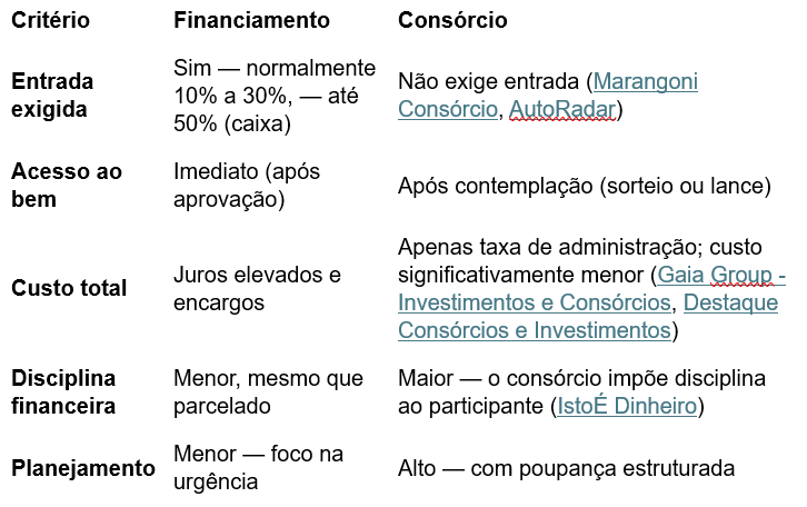 Muita gente quer o bem agora, mas sem preparar as bases. O consórcio, por sua natureza, não exige entrada, mas impõe espera — a contemplação só acontece via sorteio ou lance. Já o financiamento exige obrigatoriamente entrada — geralmente entre 10% e 30% do valor do bem, como imóvel ou veículo (Valor Investe, AutoRadar).